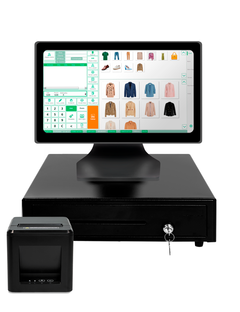 Adaptado específicamente para tu tipo de comercio. Incluye TPV táctil, impresora de tickets y cajón portamonedas.